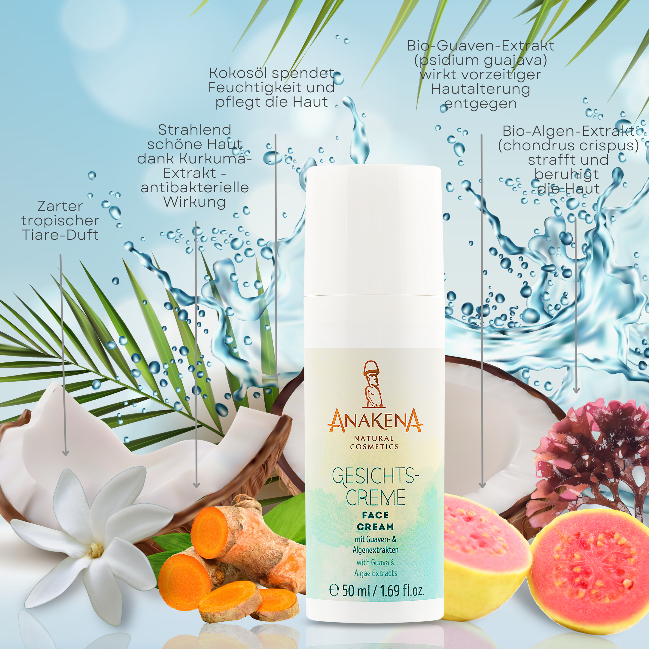 Unsere Formulierung in der Anakena Gesichtscreme kombiniert Wirkstoffe aus tropischer Pflanzenvielfalt, polynesischer Pflegetradition und moderner Naturkosmetikforschung. Hier finden Sie die wichtigsten Komponenten und ihre Pflegewirkung im Überblick: